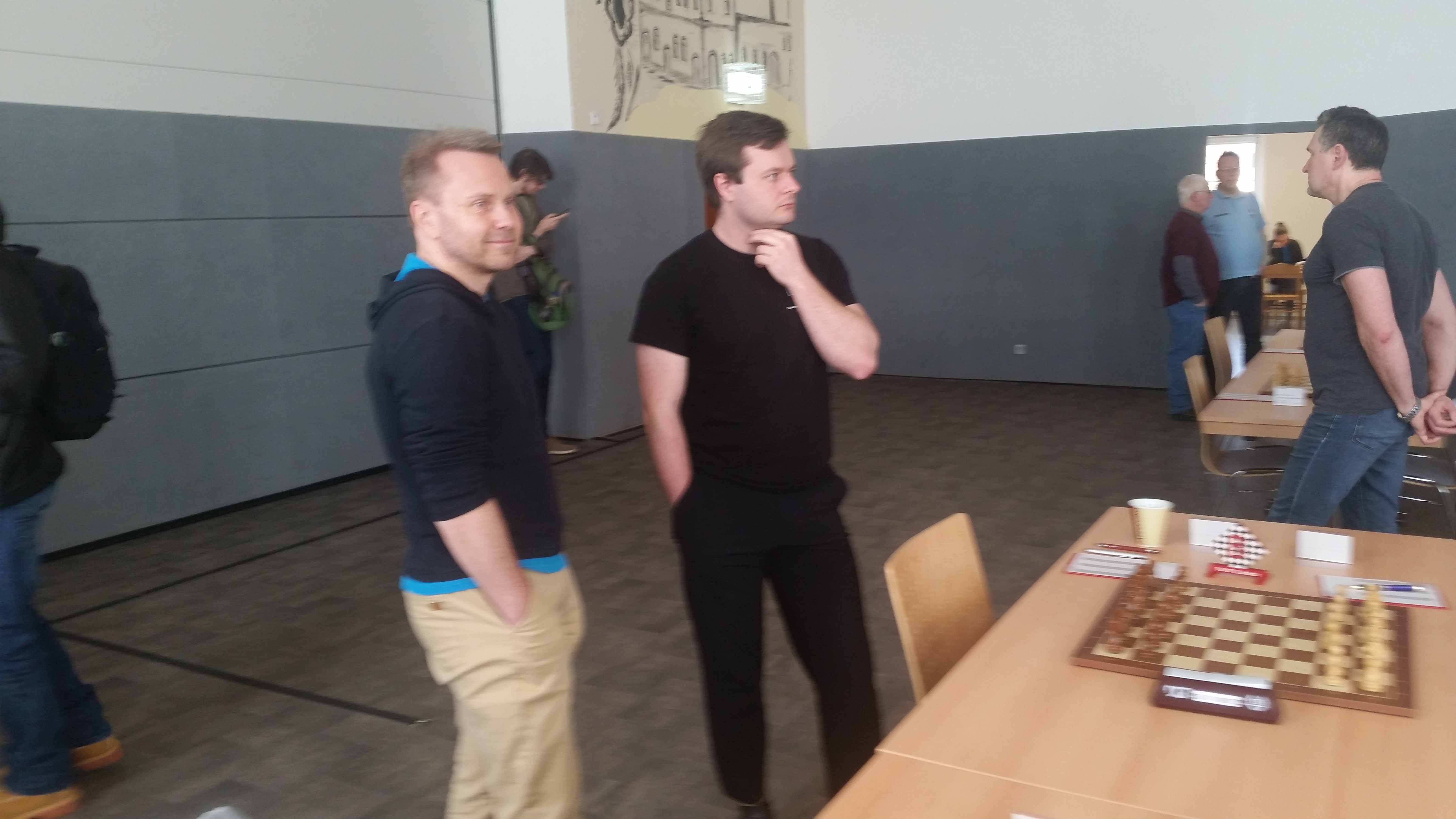 Wir wollten uns teuer verkaufen, aber ein Sieg schien im Vorfeld eher unrealistisch. Früh sicherte Robert an Brett 1 uns den ersten halben Punkt. Er kam gegen den polnischen Großmeister mit Schwarz gut aus der Eröffnung. Nachdem es ihm im abgelehnten Damengambit gelungen war, die schwarzfeldrigen Läufer zu tauschen und seine Stellung auch sonst keine Schwächen aufwies, bot der GM mit Weiß früh Remis an.