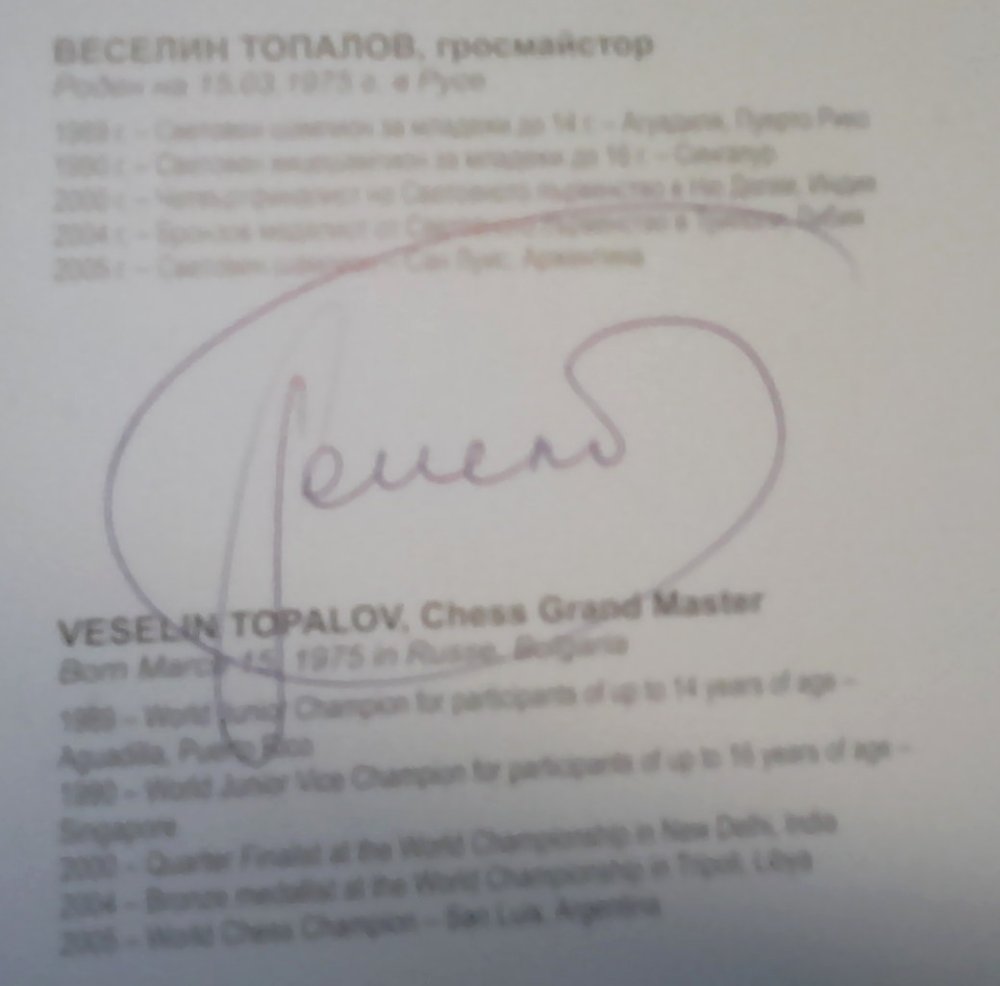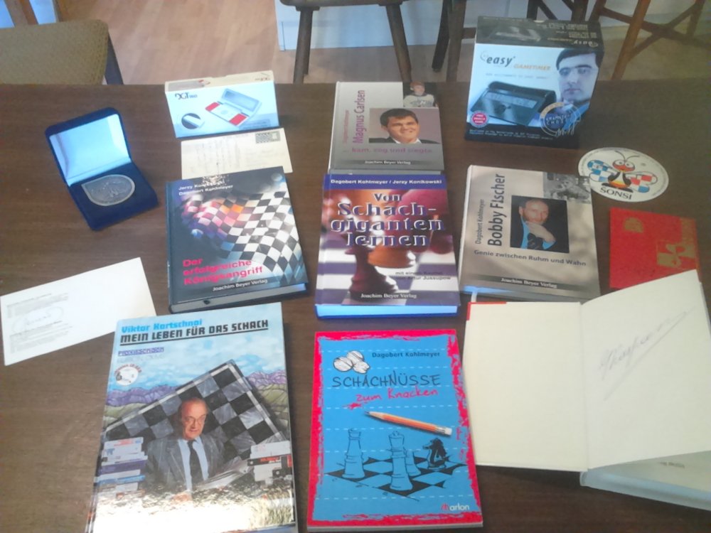 Da wurde am Ende auch was für das Schachmuseum Löberitz zusammengestellt. So einige seiner eigenen Bücher oder Übersetzungen, ein Buch mit dem Autogramm von Kasparow, die kompletten Ausgaben der offiziellen Veranstaltungszeitungen zur Schach-Europameisterschaft 2007 und zur Schach-Olympiade 2008 in Dresden, zwei Schachuhren, ein russisches Reiseschachspiel und ein Autogrammfoto von Veselin Topalov.