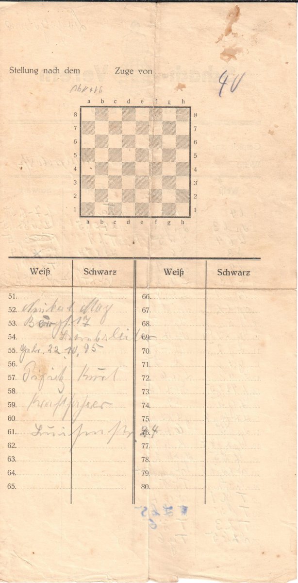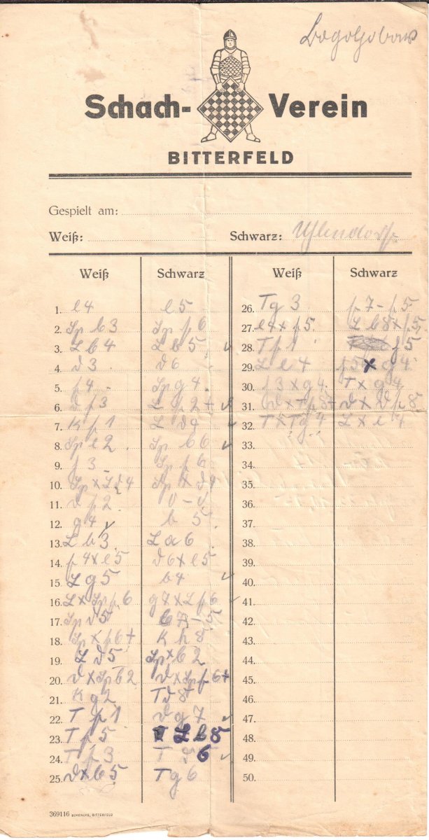 In einer Zeitung der "Deutschen Schachblätter" aus den 1930er Jahren fand ich zwei Dinge. Erstens eine Simultanpartie von Efim Bogoljubow (1889-1952). Der inzwischen schon lange verstorbene Otto Uhlendorf aus Zscherndorf bei Sandersdorf war sein Herausforderer. Die Partie wurde in Bitterfeld gespielt.