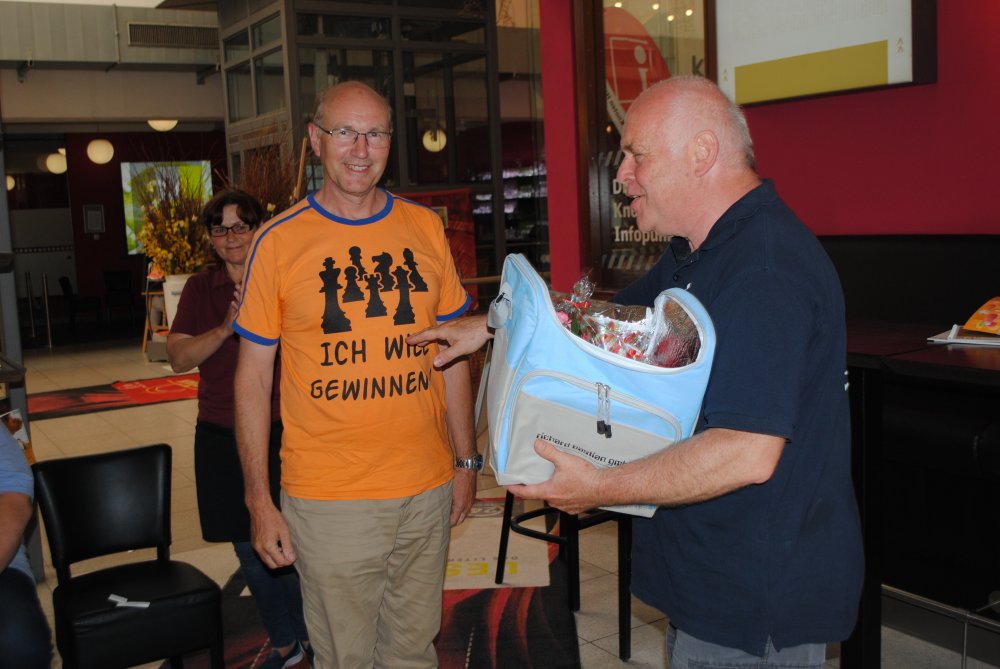 Neben dem "Punkteteiler" konnten auch einige Verlierer, die am längsten das von Alexander Naumann eingeschlagene Tempo mithielten, mit Preisen des Veranstalters Ralf Bastian und der Schachgemeinschaft Löberitz bedacht werden. So konnte auch der Sangerhäuser Dieter Gremmer seine klare und auf seinem T-Shirt abgedruckte Aussage "Ich will gewinnen!" umsetzen. Wenn es am Ende auch kein Punkt wurde, so brachte ihm seine Hartnäckigkeit wenigstens einen schönen Preis. Einen weiteren Großpreis erhielt Li Huangjia vom Roten Turm Halle.