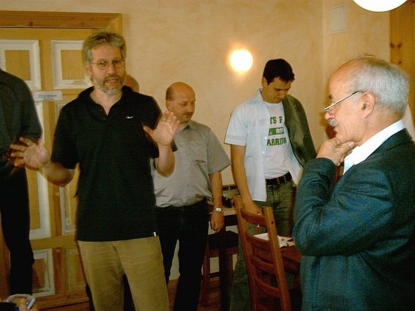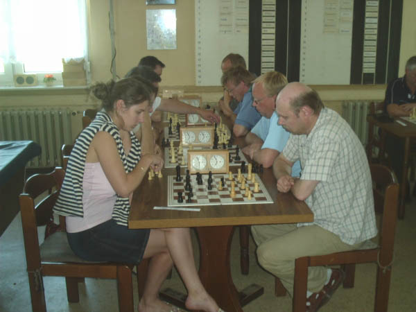 short times. First he played Brain. Brain was not charmed but he gave him one more chance .. - to play Dana. This pairing attracted the crowds who gathered around the table. And Dana succeeded to keep the result equal even having slight advantage in better positions! After these heroic deeds the brave fighters left, being substituted just two minutes later by the returning cabaretists. So, beside Zugzwang, Matthias became pleased by Hamburg sounds and some conjuring tricks on playing cards by Joachim. He immediately took revenge with memory by giving some position aspects of a match they had played nearly twenty years ago!