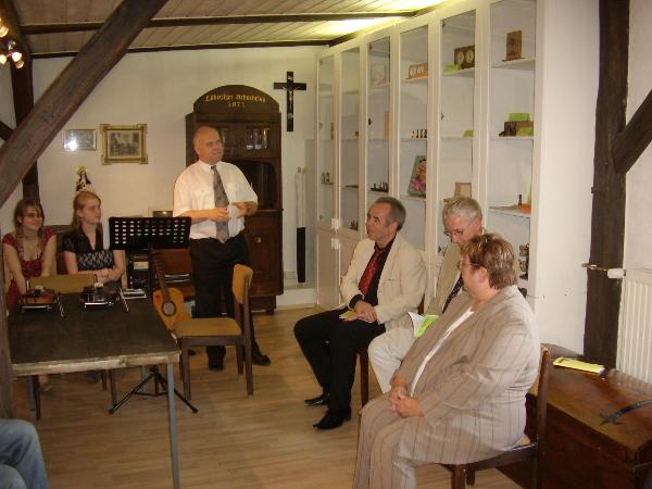 Anm. der Redaktion: Wir wollen noch kurz bei der Museumseröffnung verweilen, die ja zum Zeitpunkt der Drucklegung für die Broschüre noch in der Zukunft lag. Die Einweihung wurde am 01.06.07 im Rahmen der 800-Jahr-Feier vollzogen. Ehrengäste, Freunde und Mitglieder des Vereins sowie Besucher des Löberitzer Jubiläums waren anwesend. Unter den Worten von Dr. Günter Reinemann (Präsident des LSV Sachsen-Anhalt), Heidemarie Funke (Bürgermeisterin) und Paul-Werner Wagner (Vorsitzender der Lasker-Gesellschaft) sowie den musikalischen Einlagen von Josephine, Rebekka und Konrad Reiß wurde das Löberitzer Schachmuseum offiziell eröffnet.
