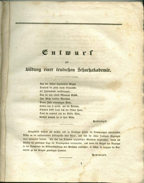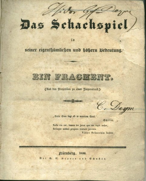 Doch auch äußerst seltene Bücher sind hier zu finden. Zu nennen ist hier "Das Schachspiel in seiner eigenthümlichen und höheren Bedeutung" von einem unbekannten Autor21), gedruckt 1836 von G. R. Renner und Schuster in Nürnberg. Es enthält als erstes Buch überhaupt einen Entwurf zur Gründung eines Schachbundes.
