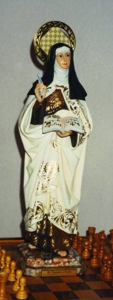 Die Schachbibliothek steht im Zeichen der Hl. Theresia von Ávila, der Schutzpatronin der Schriftsteller und Schachspieler. Die Figur wurde von Konrad Reiß und Uwe Bombien direkt aus dem mittelspanischem Ávila20) mit nach Löberitz gebracht.