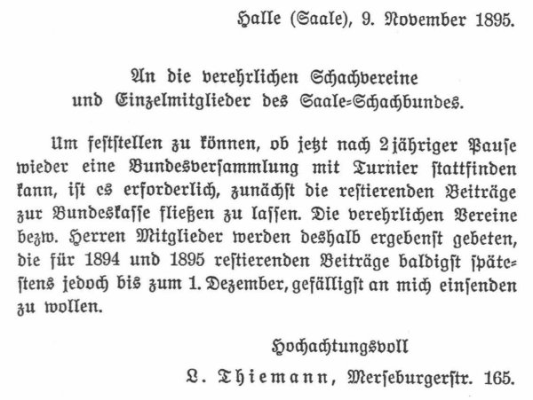 Auch 1895 kam trotz Bemühungen des Bundessekretär L. Thiemann aus Halle kein Kongress zu Stande. Es sah nicht gut aus für das Fortbestehen des Saale-Schachbundes.