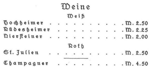 Gegen 19.00 Uhr begann das gemeinsame Festmahl. Die Gastgeber hatten hierzu entsprechende Speisekarten drucken lassen. Das Weinangebot des Abends ist uns erhalten geblieben.