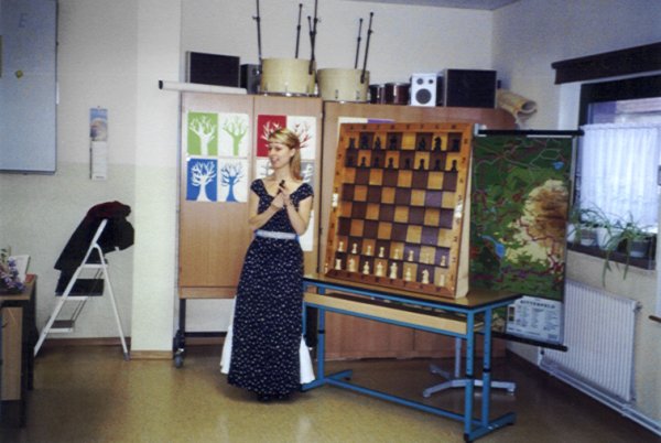 Für drei Gruppen (1., 2., 3. + 4.Klasse) haben wir dann unser Schauspiel gestartet. Ronny hat uns beide als König und Königin vorgestellt und dann hab ich an dem Demobrett begonnen das Schachmärchen zu erzählen. Alle