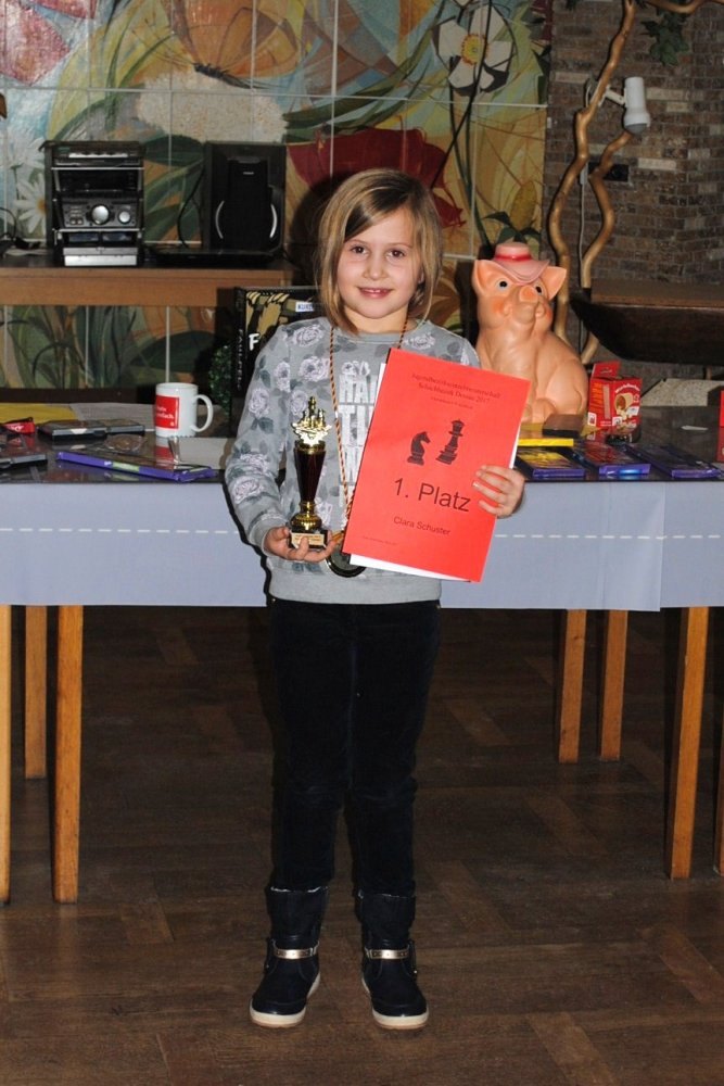 Clara Schuster, die hier als Gast neben Nils Magnus Kuhlmann aus der U 8 mitspielte, war die einzige Teilnehmerin. Sie hatte es natürlich wegen des Altersunterschieds doppelt schwer. Ihr Mut wurde jedoch mit dem Bezirksmeistertitel der AK U 8 weiblich belohnt.