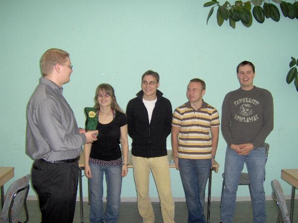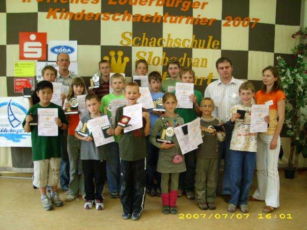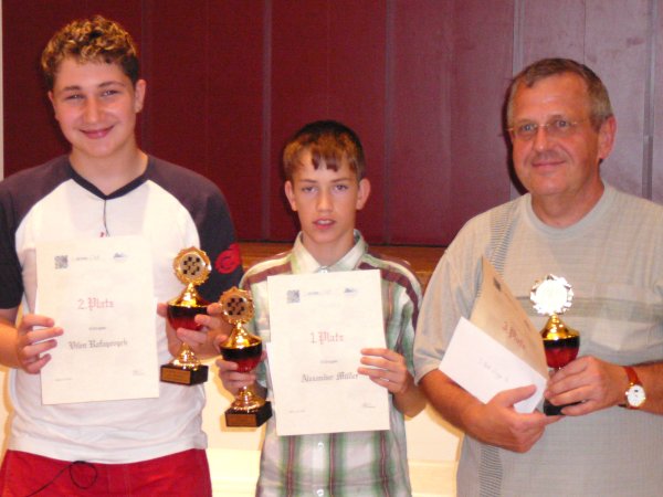 03.07.07: Sieg für Dr. Iziaslav Leibovich beim 2. Raguhner Schnellturnier. In einem ausgeglichenen Feld kamen außer ihm noch die Vereinskollegen Mikhail Zoun und Volodymyr Ozeran sowie Wolfram Hille auf 5/7. Die Löberitzer Fraktion wurde von Klaus-Dieter mit guten 4,5 Punkten angeführt (Platz 5). Heiko wurde 11. (3,5), und Konstantin erreichte 1 Punkt und den u14-Preis. In vielen Partien hielt er schon sehr gut mit.