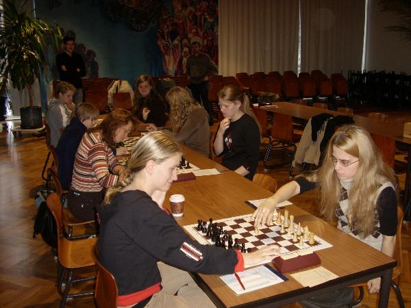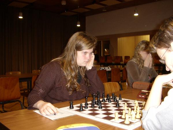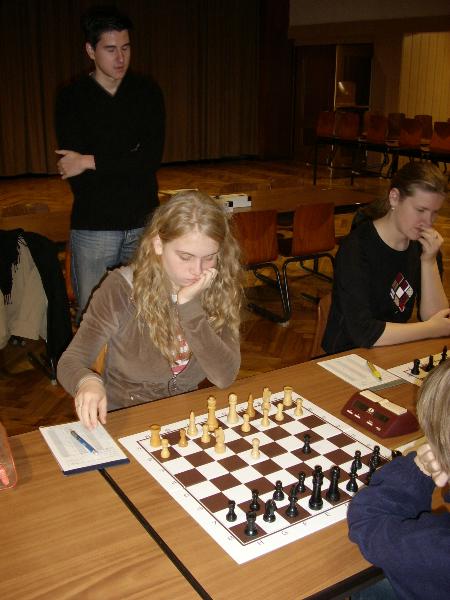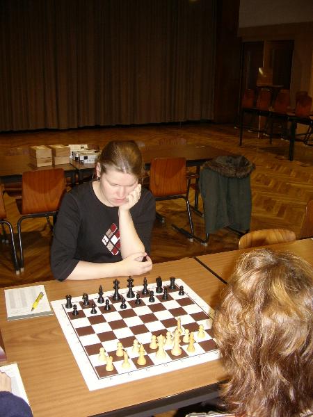 Antje war wohl noch mit einem Bein im Bett ;-), als sie ein bekanntes taktisches Motiv im angenommenen Damengambit zuließ. Sie wollte den Bauern c4 unbedingt halten. Der Kampf währte noch sehr lange, war aber schlussendlich nicht von Erfolg gekrönt.