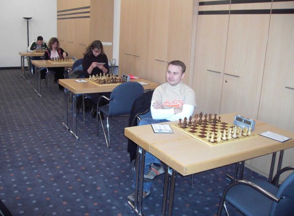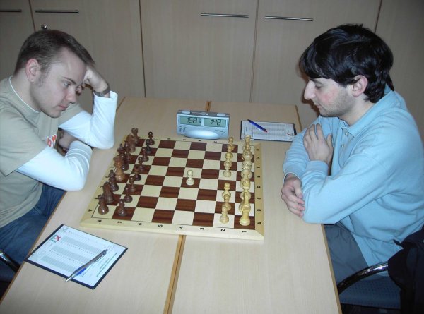 Gegen 14.30 Uhr saß dann zum ersten Mal die Stammaufstellung an den Brettern 1 bis 8. Rochade, die uns schon im letzten Jahr bezwungen hatten, setzte an den letzten beiden Brettern auf die Jugend. Yogi und Simon taten sich beide recht schwer und kamen nicht über ein Remis hinaus. Vor allem bei Simon war die Schlussstellung schon mindestens unangenehm. Bei Mike und mir stand wie letzte Saison Skandinavisch zur Diskussion, diesmal allerdings mit vertauschten Farben. Da ich aus der Eröffnung nicht rausholen konnte, rauchten wir schnell die Friedenspfeife.