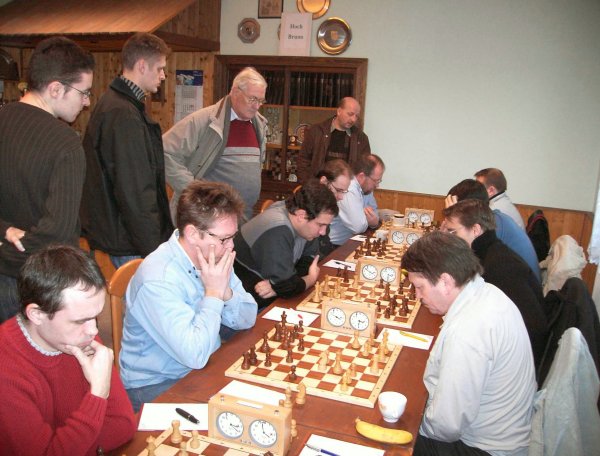 Eingangs der Zeitnot ging dann alles recht schnell und mit teilweise unerwarteten Ergebnissen vorbei. Hollys Sieg machte den Auftakt, denn nach noch korrektem Figurenopfer Minis war er im darauffolgenden Zug zu gierig und wollte den zweiten Bauern anstatt mit f4 weiter nach vorn zu spielen. Holly nutzte diese Ungenauigkeit souverän zu seinem dritten Sieg am Stück. Plötzlich geschah auch positiv Wundersames bei Harald und mir, denn unsere Gegner übersahen in unklarer bzw. remiser Stellung taktische Tricks, welche zum sofortigen Verlust führten. Brain erhielt unterdessen ein Remisgebot, welches er aber ablehnte, denn seinen, wie gewohnt souverän herausgespielten Weißvorteil wollte er diesmal verwerten.