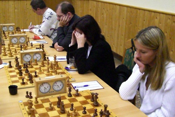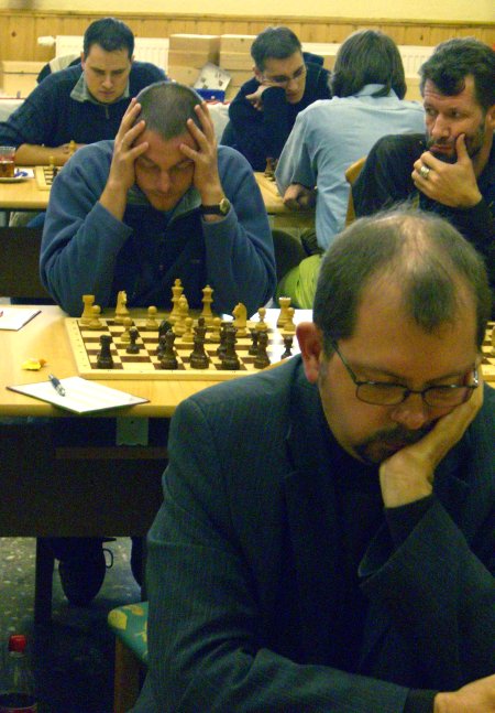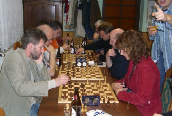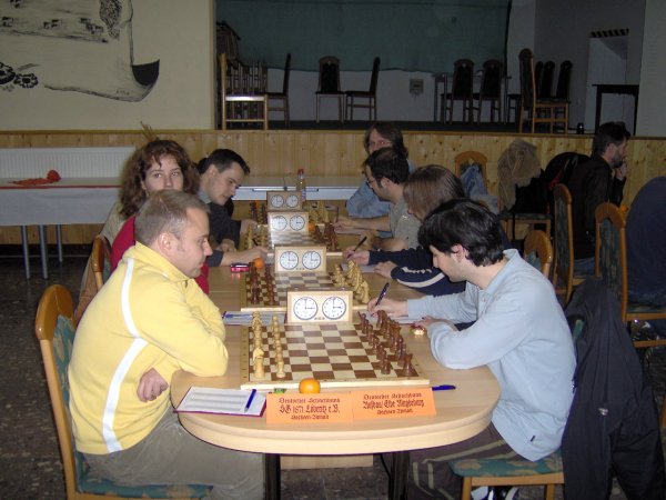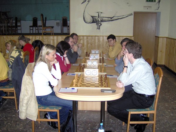Harald, auch wenn es um seine Technik nicht zum Besten stand. Im 40. wäre auf Grund eines fehlplazierten Läufers optimalerweise nur noch ein Remis zu erreichen gewesen, aber Ralf Seibicke spielte den entscheidenden Zug zu schnell und verlor danach chancenlos. Währendessen verkombinierte sich Dana und verblieb in einem hoffnungslosen Endspiel mit Minusläufer. Also wieder ausgeglichen. Yogi zerlegte den zu übermütig opfernden Laszlo Pesztericz sauber und wir gingen wieder in Führung. An 4 entwickelte sich aus einem interessanten Drachen eine Stellung mit