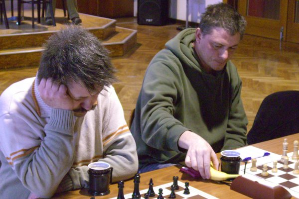Thomas fühlte sich dann verpflichtet "irgendwas" zu machen. Nach und nach verschlechterte er damit seine Stellung und Hollys Vorteil wuchs. Nach schwarzem g5 war der h6 plötzlich undeckbar, im 40.Zug überschritt Thomas Grieger dann die Zeit, die elektronische Uhr war schon auf 1 h umgesprungen. Nun war Thomas Hartung gezwungen, das nahezu totremise Damenendspiel nach Gewinnmöglichkeiten zu durchforsten.