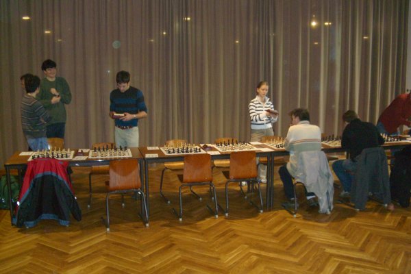 Links und rechts von mir zwei leicht bessere Stellungen. Nun überschlugen sich die Dinge: Zunächst musste Riker die Waffen strecken, erst war der f2 futsch und als die Dame dann auch noch diagonalisierte, da war es um den weißen Monarchen geschehen 0-1. Ich weiß nicht ganz genau, ob ich es richtig wiedergebe, aber FM Harald hat wohl ein Doppelschach gegeben, woraufhin Honk nur eines abwehrte - jedenfalls wurde mal kurz die Uhr zurückgedrückt, da ja Doppelschach war. Dabei gewann Harald die Dame, die Materialverteilung änderte sich kurze Zeit später aber in Dame vs. Turm+Läufer, also noch keine Entwarnung. Yogi ließ - wie wir in der Analyse feststellten - den Gewinn aus und verlor wenig später, sehr schade! Konrad hatte aber inzwischen gesiegt, Marcus war etwas unachtsam mit seinem Material umgegangen und vergriff sich dann zu allem Übel auch noch.