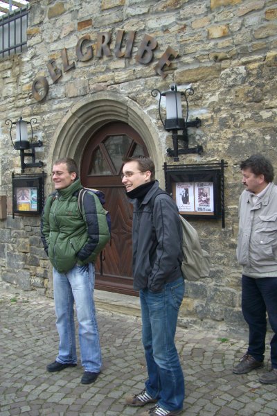 Mit der Info, ausnahmsweise nicht die "Mampfe" aufsuchen zu müssen, trudelten wir gegen 9.45 Uhr allesamt vor der Oelgrube - dem anberaumten Spiellokal - ein. Alle? Zumindest wir waren vollständig. Als klar wurde, dass das biblische "Klopfet an, so wird euch aufgetan" in Merseburg nicht gilt, wurde ML Honk alias Tobias Richter in rege Betriebsamkeit versetzt. Zunächst versuchte er, jemanden zu organisieren, der uns öffnen sollte, doch leider ohne Erfolg. Die Uhr schlug 10, Konrad spazierte eifrig durch die Innenstadt, als Schiri Dan-Peter Poetke am vermeintlichen Spiellokal auftauchte. Wir bekamen mit, dass die Option Mampfe nun doch wieder ins Gespräch kam - eigentlich aber doch nicht, schließlich wollten die Betreiber gegen 14.00 Uhr schließen. Das Stichwort "Hängepartien" fiel.