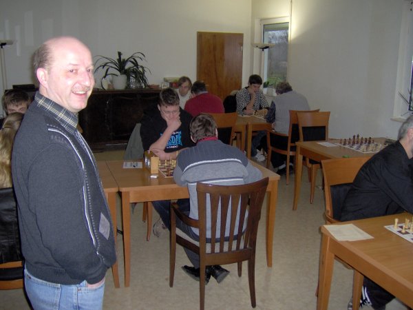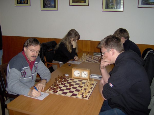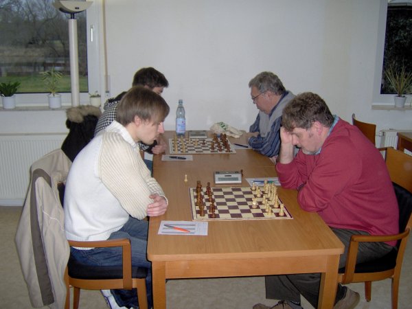 Zu diesem Zeitpunkt verwalteten Bekka gegen Marcus Bertz und Klm gegen Uwe Ritter die angenehmeren Stellungen. Ruhig ging es bei Klaus-Dieter gegen Mario Windolph zu, während der Doc gegen Johannes Klaus und Heiko gegen Torsten Beume unter Druck geraten waren. An Brett 1 war mir meine Lage gegen Dustin Lichey selbst nicht ganz klar. Ausgangs der Eröffnung ging viel Zeit für die eine oder andere Verwicklung drauf.