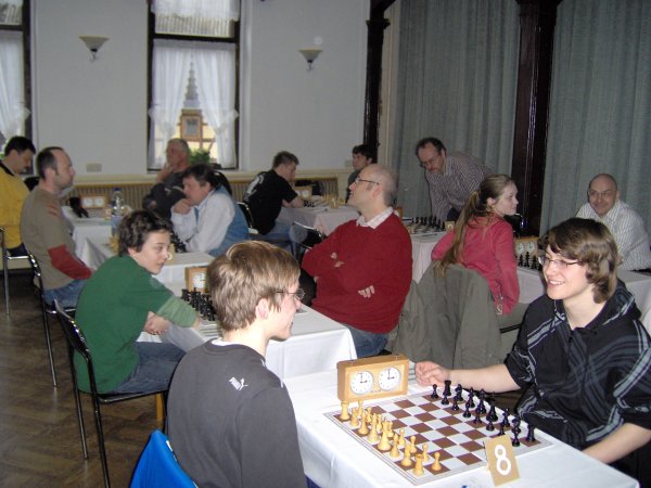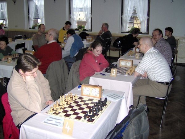 Es kam also so, dass die letzten beiden Bretter verloren und Riker unter starkem Zeitdruck zu leiden hatte, jedoch konnte er dem Gegner zu viel Druck machen, sodass dieser ebenfalls in Zeitnot die Dame opferte, um ein drohendes Matt abzuwehren, doch mit der Mehrdame und dem geschwächten weißen König gewann Riker spielerisch leicht. Nun lag es nur noch am Brett 5 den Ausgleich zu holen. Dort hatte sich Pauline ein bisschen aus der Misere befreit und konnte auch Drohungen mit dem einen Turm des Doppelturmendspieles mit je einer Leichtfigur ausüben, was schließlich zum Rückgewinn des Minusbauern führte. Nach dem folgenden Turmtausch konnten sich beide Seiten einen Freibauern bilden, aber es gab für keinen einen zwangsläufigen Gewinnweg und so wurde Remis zu Gunsten der Leipziger gegeben, die somit viereinhalb zu dreieinhalb gewannen, aber immerhin vollendete Pauline damit einen ganzen Punkt^-^.