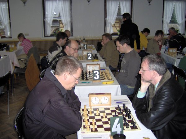 Die erste Runde des Doppelrundenwochenendes sollte mit den Spielern des Leipziger Vereins Lok Mitte II beginnen. Nach etwas mehr als anderthalb Stunden machte zuerst Holly an Brettnummer 2 Remis, wenig später folgten dann Brett 4 mit Simon, Brett 1 mit Normi und Brain an 3 mit ebenfalls Remisergebnissen. Doch nach einer ausführlichen Analyse von Normis Partie war klar, dass vorher mehr als das Unentschieden drin gewesen wäre.