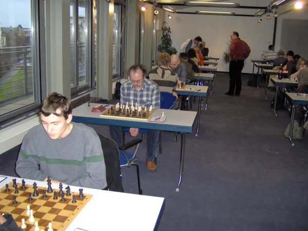 Gespielt wurde wieder in dem schönen Gebäude der Volksbank Halle, das gute Bedingungen für die beiden Runden bot (nervig nur wie immer die Klingel ...). Für uns ging es am Samstag gegen unsere ehemaligen Reisepartner aus Löberitz. Hoffend, dass sich der Vorjahreserfolg wiederholen könne. Der Kampf war auch durchaus interessant. Tom hatte gegen Dana ungewöhnlicherweise das erste Remis auf dem Brett, nachdem er im Drachen die Varianten vermixte. Kurz auf ihn folgte Claudia, die das Gebot Simons annahm. Dann wurde es langsam intereressant. Heinz bezwang Mikly