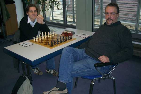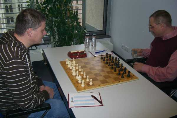 Befreit von allen Sorgen konnten wir nun am Sonntag gegen die klar favorisierten Chemnitzer antreten. Ich sicherte mir nach langer Durststrecke (0-0-0-0-0) den ersten halben Punkt, indem ich meine erstmals erfolgreiche Vorbereitung auf das Brett bekam und schnell Remis bot. Ich konnte nur noch einen kurzen Blick auf die anderen Bretter werfen, bevor ich mit Riker nach Merseburg zum Spitzenspiel gegen Sangerhausen fuhr. Interessant hier war insbsondere die Eröffnungswahl Toms, der ohne zu zögern das "solide" Sd7 setzte und Reyk schon auf eine Musterpartie hoffen ließ. In der Tat scheint Schwarz relativ schnell ausgeglichen zu haben.