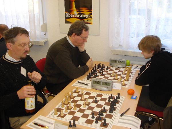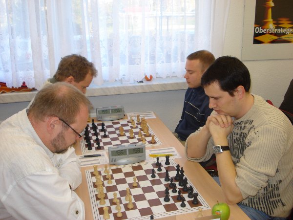 Postwendend folgte der Ausgleich an drei kurz nach der Zeitnotphase. In einem Holländer war Simons Freibauer auf b7 kein ausreichendes Gegengewicht zur Bauern-Streitmacht von Eckehard Pönisch am Königsflügel. Dennoch waren wir guter Hoffnung. Ich denke, Bekka hatte eine ordentliche Stellung gegen Michael Teichgräber und Rolandus verwaltete einen Mehrbauern mit guten Siegchancen gegen Coswigs Erstatz- und Monitormann Sebastian Liebscher. Vorn wurde gekurbelt, wenn auch hart an der Remisbreite. Einzig bei Jens Piotraschke vs. Yogi deutete sich an, dass letzterer den Coswig-Fluch ("Hier habe ich schon mit SG '67 verloren.") wohl noch nicht würde ablegen können.