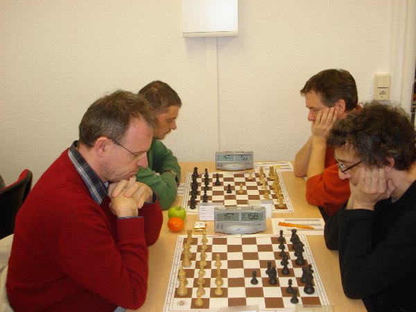 An sechs (Matthias Merker vs. den Berichterstatter) konnten wir in Führung gehen. Ein scharfer Grünfeld-Inder mit weißem Qualitätsopfer auf a1, aber in einer weniger bekannten Ausführung aus dem Sf3-System heraus. Das Rückopfer der Qualität brachte den im Zentrum verbliebenen weißen König in Schwierigkeiten.