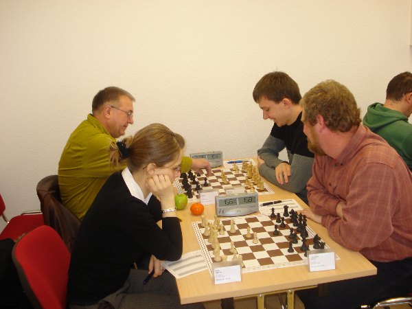 Erstes Zählbares für Pauline! Fein :) Gegen den favorisierten Egmont Pönisch hatte sie immer alles im Griff und zwischenzeitlich gar leichte optische (Läuferpaar-)vorteile. In einer zugeschobenen Endspielstellung ging aber gar nichts mehr und nach langem Zögern nahm Egmont die Remisofferte an.