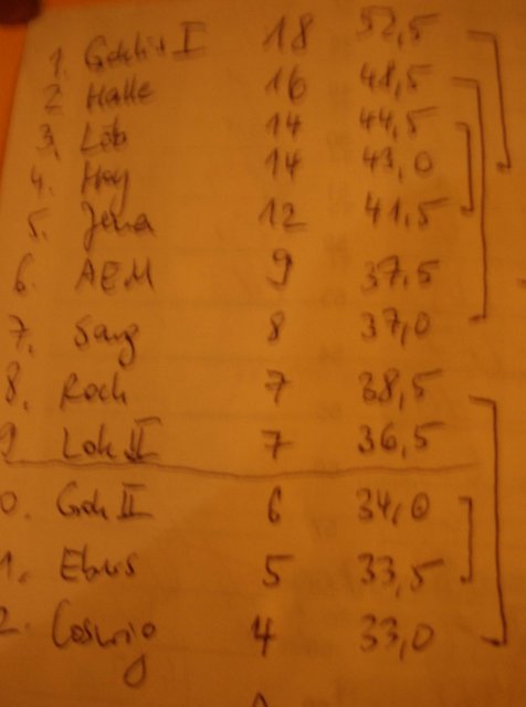 Und natürlich wurde die von Brain handentworfene Tabelle hoch und runter gewälzt. Zunächst stellten wir fest, dass wir gegen Jena nicht 2,5 oder höher verlieren sollten. Im Vergleich zum Abstiegskampf war das aber eher ein Nebenkriegsschauplatz. Harald musste einräumen, dass Coswig wohl nicht mehr zu retten sein würde. Normi suchte nach Chancen für Gohlis II. Wir waren außerdem überrascht von der Rochade-Niederlage in derart starker Besetzung und kamen zum Schluss, dass es für Sangerhausen noch nicht reicht.