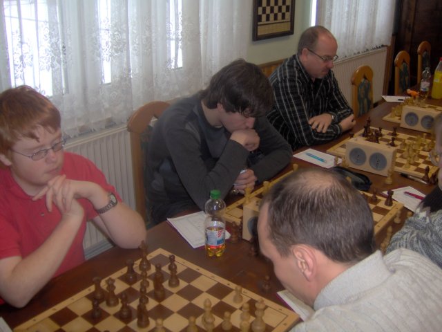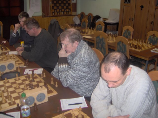 Nun, eigentlich wollte ich nicht wieder der erste sein, der fertig wird, aber mein Gegner machte mir das Leben leicht. Erst gewann ich zwei Bauern, dann eine Dame nach Springergabel, einen Turm und so ging es gemütlich weiter. Zum Schluss blieben mir zwei Türme und drei Bauern übrig, die den Sieg bescherten nachdem ich die Dame gegen Turm und Läufer noch tauschte. Also 1:0 gingen wir in Führung und kurze Zeit später bot Jürgens Gegner Remis, was er aber richtigerweise ablehnte, da er einen Mehrbauern hatte und auch sonst viel aktiver stand.
