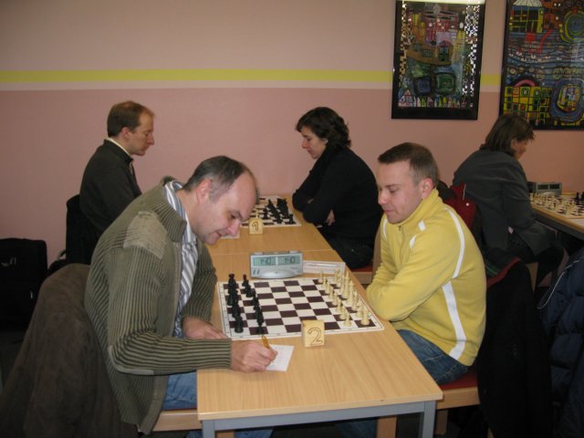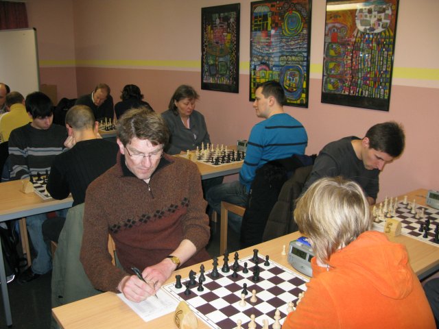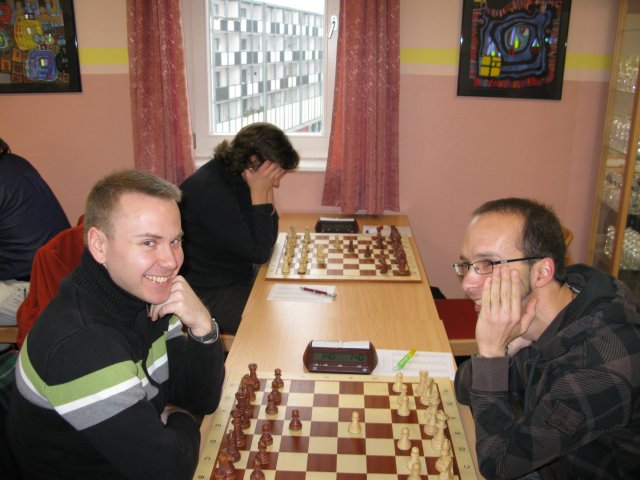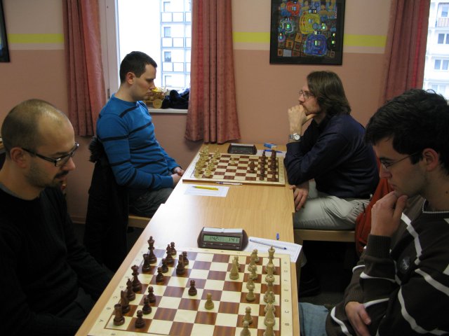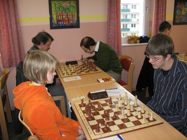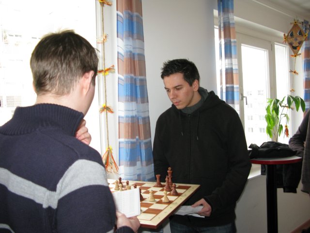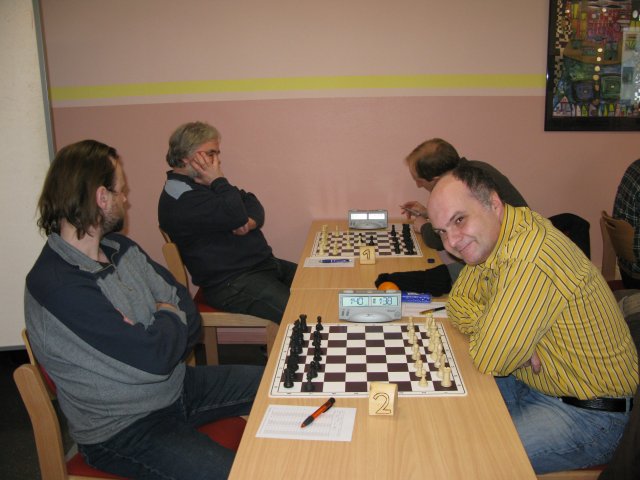 Die Entscheidung fiel in der Zeitnotphase. Da ich selbst mal wieder in Zeitnot kam, habe ich allerdings nicht alles mitbekommen. Brain lehnte Roberts Remisgebot zwar zunächst ab, aber einige Züge später willigte er in einer sehr ausgeglichenen Stellung dann doch ein. Harald ließ wohl eine Gewinnchance aus und musste sich dann geschlagen geben. Pauline spielte sehr solide und einigte sich dann