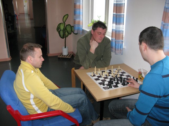 Nach einer kurzen Nacht stand die Sonntagmorgenrunde gegen Rochade auf dem Programm. Im Gegensatz zu AEM hatten wir mit Rochade meistens Probleme. Vielleicht konnten wir ja auch hier den Trend umkehren. Pünktlich um 9 traf sich mehr als die Hälfte der Mannschaft am Spiellokal. Der Spielverlauf war recht unspektakulär. Mike und ich einigten uns wie fast immer schnell auf Remis. Als nächstes waren Brain und Yogi fertig. Brain konnte mit Schwarz ausgleichen und man schüttelte dann auch hier schnell die Hände. Yogi