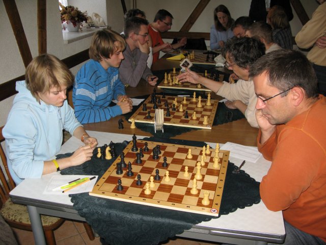 Dennoch ließ sich der Kampf recht gut an. Schnell hatten wir gute Stellungen an 1 und 2 herausgearbeitet, Dana und Holly vollstreckten sicher 2:0. Christian "erfreute" die Mannschaft mit einem seiner Kurzremisen. Mit Weiß nicht gerade das, was man erwartet, ein wenig mehr Kampfgeist gepaart mit etwas mehr Mut bei der Eröffnungswahl wären da wünschenswert. Sei es drum 2,5:0,5.