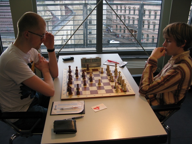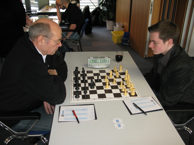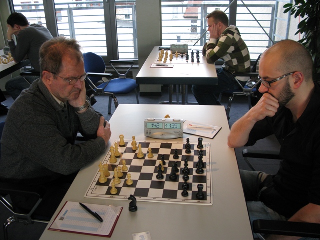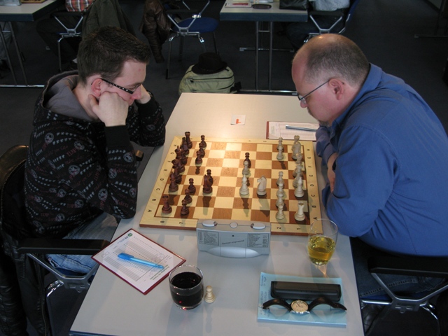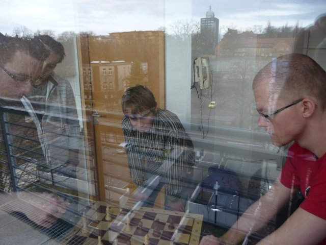 Dem Remis von Simon folgte sehr schnell auch noch ein Remis von Reyk gegen George Gregor. Während ich meinem Gegner im Paulsen mit Ld3 und dem Plan am Königsflügel trotz kurzer Rochade mit f4-f5 zu öffnen sehr stark zusetzte und eine sehr gute und bessere Stellung erhielt, wurden die Partien von Brett 1 bis 3 ebenfalls Remis gespielt. Ich stellte mich in meiner nunmehr klar besseren Stellung ungeschickt an, so dass sich mein Gegner durch Abtausch wieder herauswinden konnte und mir Remis bot, welches auch ein paar Züge später unterschrieben wurde.