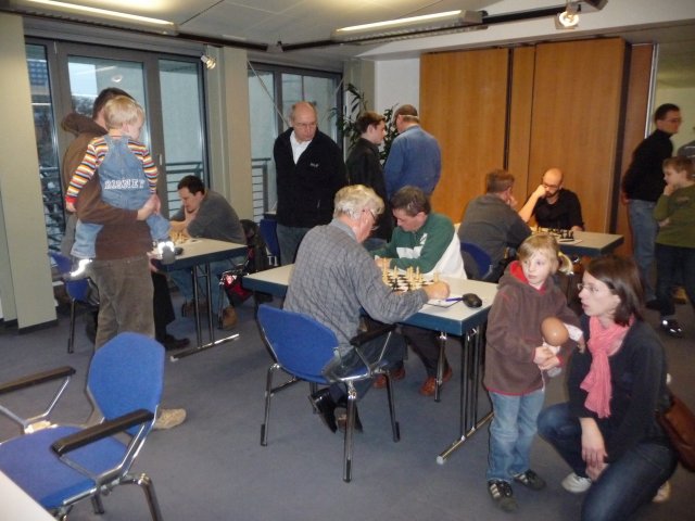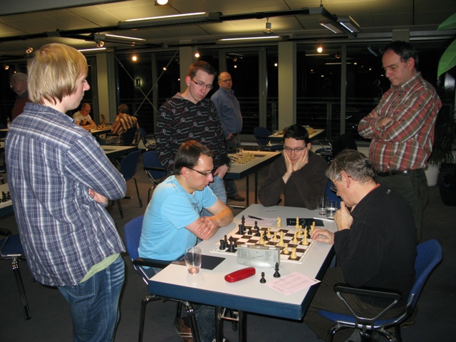 Sehr schnell, so gefühlt nach einer halben Stunde, es mag auch eine Stunde gewesen sein, war Normi schon fertig und hatte seinen Gegner eiskalt niedergeschlagen. Aber schon kurze Zeit später stand Frido so schlecht, dass er sich geschlagen geben musste, womit es 1:1 stand, aber die anderen Partien waren nicht so klar. Ich fühlte mich in meiner Sizilianisch-Stellung recht wohl, aber wie das im Sizilianer so üblich ist, war die Position nicht ganz einfach zu verwalten. Christian hatte ein Doppel-Turmendspiel auf dem Brett und schaffte als nächstes ein Remis. Auch Brain musste sich mit einem Remis zufrieden geben. Aber Harald konnte uns mit seinem Sieg in