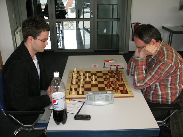Nebenbei möchte ich darauf hinweisen, dass auch der Kampf zwischen Sangerhausen und Halle II zu diesem Zeitpunkt 4:3 für Sangerhausen stand. Die letze Partie wurde von Oliver Duchrow gegen Karl-Heinz Leonhardt gespielt, wobei der zweitgenannte eine Mehrfigur hatte, die dann aber vom Brett verschwand und so in ein Turmendspiel mit je zwei Bauern führte. Beide zuletzt laufenden Partien waren sehr spannend.