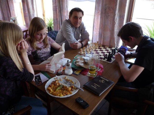 Zu diesem Zeitpunkt war ich durchaus froh, dass der Sieg im Kasten war. Miklys und Chevaliers Stellungen gefielen mir nicht so. Mikly war zunächst als Schwarzer im Franzosen gut ins Spiel gekommen, hatte dann aber die Rochade versäumt. Die dynamische Kompensation für den französischen Läufer drohte zu verebben. Gerade als ich mir Sorgen machen wollte, entstand aber unvermittelt ein Endspiel mit schwarzem Mehrbauern. Der allerdings nicht zu verwerten war.