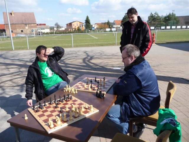 Die II. Mannschaft musste das Spitzenspiel gegen Muldeaue gewinnen, um vorbei zu ziehen und die Spitzenposition zu erobern. Wir erwarteten einen ausgeglichenen Gegner mit Thomas Krannich (bis dato 6/7) an der Spitze. Nach einigen Überlegungen schickten wir Normi gegen den Spitzenmann und Frido dafür zur Verstärkung der Flügelzange in die I. Der Autor sollte im Gegenzug Brett 2 der II. besetzen. Außerdem wurde ein zweites Mal Münzi für Brett 8 aktiviert.