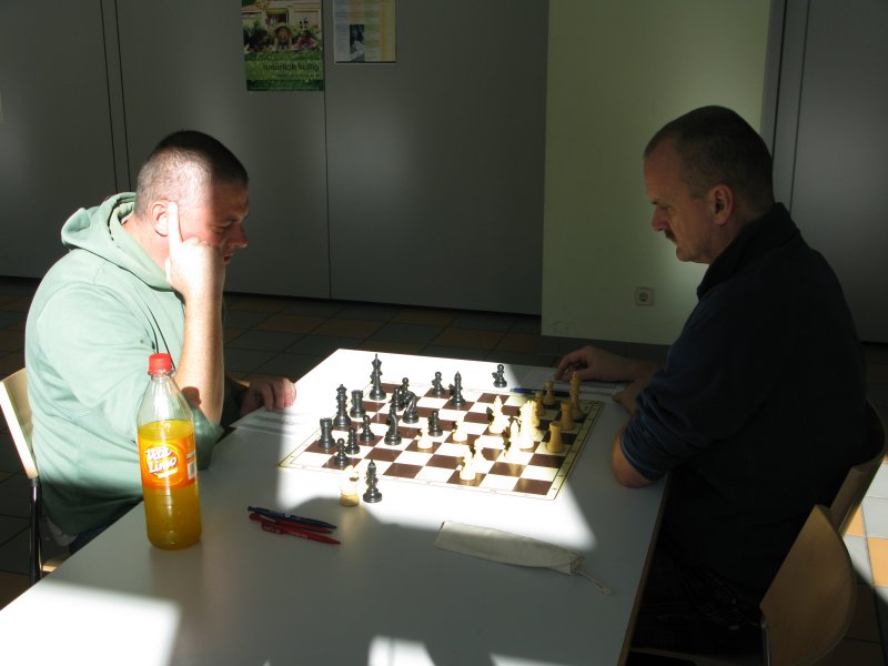 Schon recht schnell nach 18 Zügen einigten sich Christan und sein Gegner auf Remis. Zwar stand Christian leicht schlechter, doch es war alles noch im Rahmen des Erträglichen, zumal er mit Aljechin eine für Schwarz leicht schlechtere Eröffnung gewählt hatte und sich so glücklich schätzte, schnell ein Remis zu bekommen. Nach ihm waren Simon und Normi ebenfalls recht zügig fertig. Simon gewann in einer Art der Englischen Eröffnung. Der gegnerische König hatte nicht rochiert und die Dame war auf Bauernfang gegangen, sodass es Schwarz möglich war, das Zentrum zu öffnen und einen tödlichen Königsangriff zu führen, der nach 35 Zügen bereits zum Sieg für Simon führte. In Normis Partie wurde im Scheveninger System mit schwarzem h5 gespielt. Weiß gruppierte drauf hin den schwarzfeldrigen Läufer von e3 nach h2 um, der jedoch durch ein einfaches e5 von Schwarz dann wieder ins seiner Wirkkraft eingeschränkt wurde. Dieses Manöver gab Normi die Zeit sich am Damenflügel auszubreiten und den König in Bedrängnis zu bringen. Auch Weiß versuchte einen Königsangriff zu initiieren, aber selbst das Turmopfer konnte keine Bedrohung darstellen und so gewann Normi mit klarem Vorteil ebenfalls noch vor Zug 40.