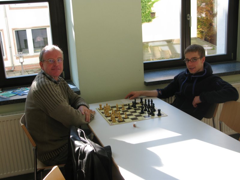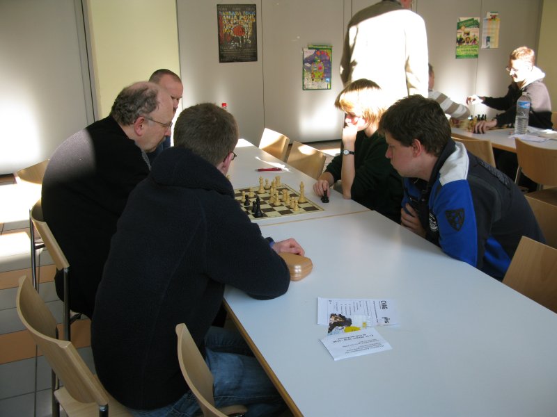 Schon am Freitag sollte die Reise für Frido und mich nach Löberitz zur Vorbereitung auf die Doppelrunde beginnen. Wir waren auch sehr pünktlich noch vor der verabredeten Zeit in Löberitz und warteten nun auf Normi. Unsere Wartezeit konnten wir ganz gut mit Kiebitzen beim Fußballtraining von Vier- bis Sechsjährigen überbrücken und bald darauf wurde dann auch die Tür geöffnet. Bis Normi dann auftauchte, wurde mit Konstantin und Heiko geblitzt, sowie Taktikaufgaben gelöst. Bald konnte auch die Vorbereitung losgehen. Während der Eine die Partien seines Gegners anschaute, beschäftigte sich der Andere mit der Praxis, denn mittlerweile war der Raum gut gefüllt mit vielen Schachhungrigen.