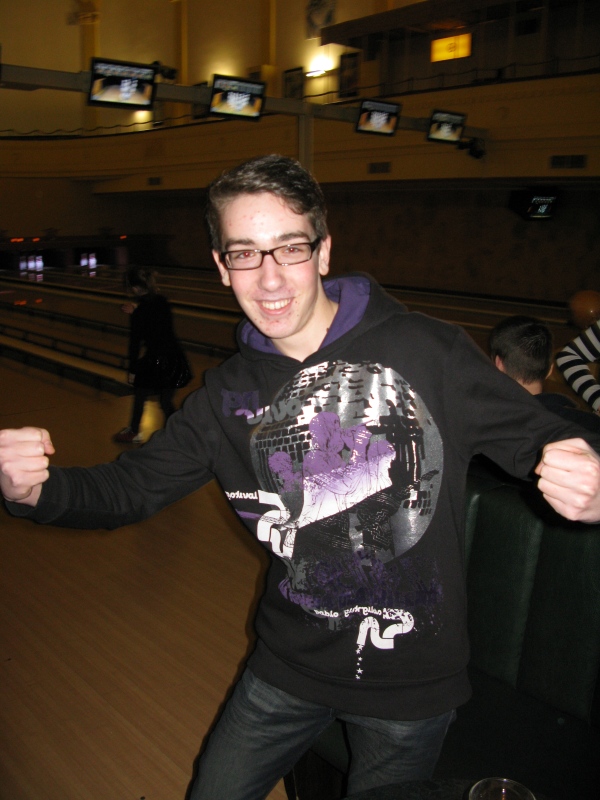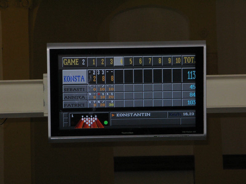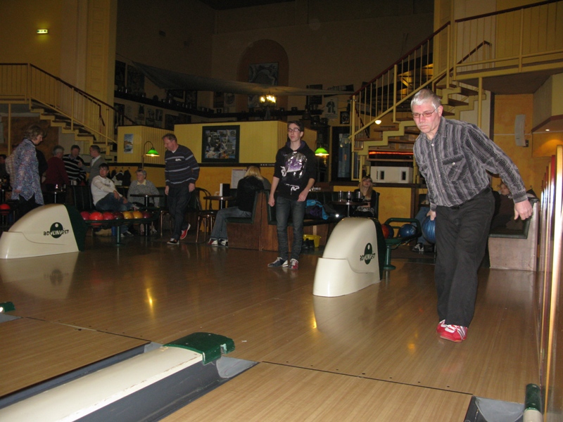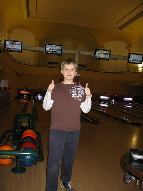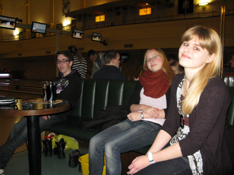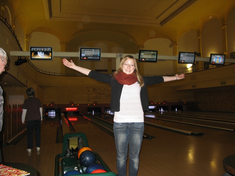 Gegen 18 Uhr trafen wir diese dann an dem Bowlingcenter, wo wir uns die nächsten zwei Stunden vergnügen wollten. Und genau dies taten wir auch: Auf zwei Bahnen ließen wir die Kegel umfallen, und Patricia, die zu Anfang Startschwierigkeiten hatte, ließ uns alle in ihrem Schatten und zog mit über 300 Punkten in Führung. Natürlich dürfen wir nicht die Männer vergessen, die auch sehr gut waren, jedoch mehr Runden hatten, weil sie nur zu dritt auf der ersten Bahn waren, und die vier "Kinder" auf der zweiten.