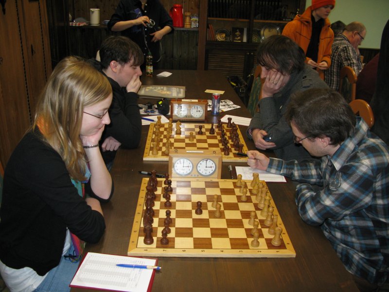 Zu den schachlichen Geschehnissen, da ich gewohnt optimistisch bin, sah ich auch gegen das starke und erfahrene Team aus Zeitz gute Chancen auf mindestens einen Punkt und die erste halbe Stunde hätte nach Plan laufen können. Hätte, wenn Mikly einfach den eingestellten Bauern mitgenommen hätte, Konstantin nach der Ungenauigkeit Lf5 ambitionierter agierte hätte, Patricia und Sebastian ihr Repertoire genauer gekannt hätten. Alles noch kein Beinbruch, die nachfolgenden Entwicklungen schon: