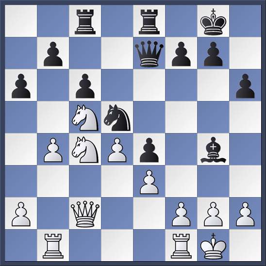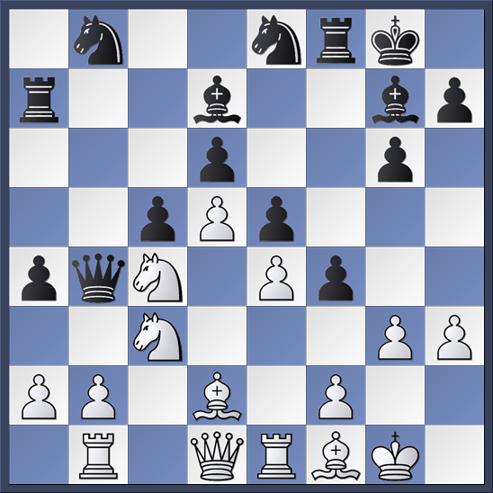 Ausgangspunkt war 19.g;f (nicht 19.S:d6 f;g!, wonach 20.f;g an 20...S:d6 21.Sb5 T:f1+ scheitert) e;f 20.S:d6 S:d6 21.Sb5. Materiell ist Black ok, aber die weißen Mittelbauern sind zu stark.