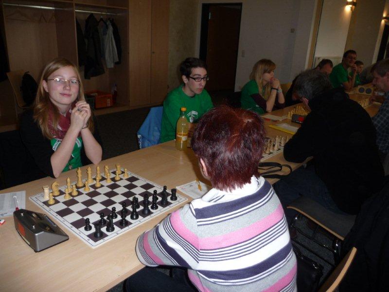 Gert an 8 war unsere einzige Konstante in der Vorbereitung, aber es kam anders. Dennoch war Annika immer noch im DWZ-Nachteil, was sie durch einen beherzten Angriff bei heterogenen Rochaden wett machte. Im damenlosen Mittelspiel kam sie durch starken Druck gegen f7 klar in Vorteil. Uschi stellte in Bedrängnis eine Figur ein, und wir gingen in Führung. Stark, Annika!