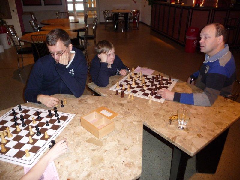 Als erster war nach ungefähr 2 Stunden Reyk fertig. Er hatte leider gegen Katja Hartung verloren. Katja hatte eine Zwischenzugmöglichkeit gesehen, die er unterschätzt hatte. Also 0:1. Zehn Minuten später war ihr Berichterstatter fertig. Ich hatte nach einem Schnitzer meines Gegners zwei wunderschöne Springer. Als er dann noch eine taktische Kombination übersah, war der Sieg perfekt. 1:1