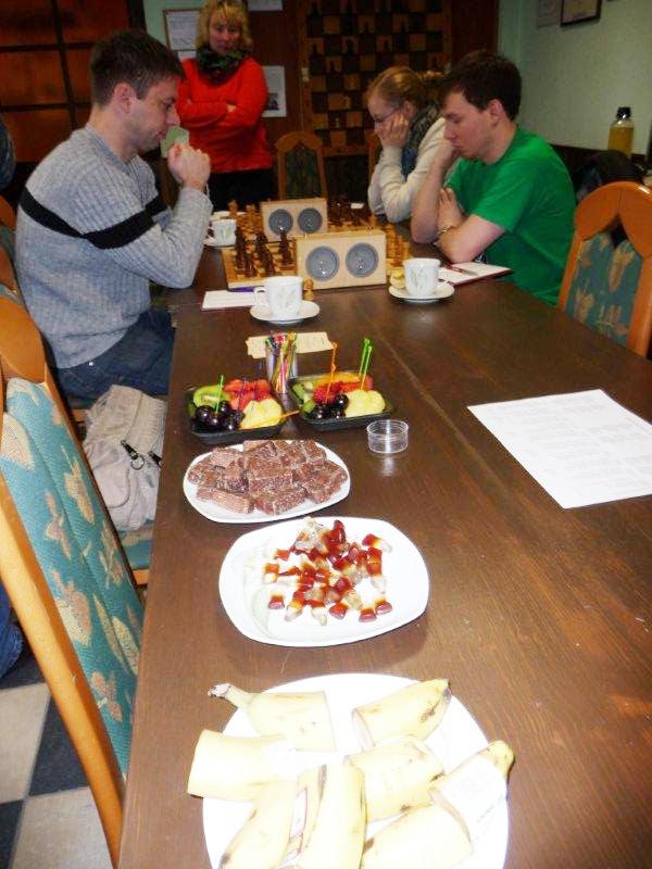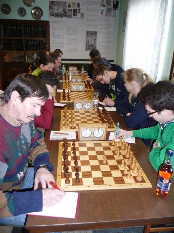 Mikly – unser drittes Dauerschwarzbrett – wurde überrascht von den Ansetzungen und entschied sich wie Anett nicht für seinen Franzosen, sondern eine Art Moderne Verteidigung. Soweit ich es mitbekommen habe, pendelte die Partie bis in die beiderseitige Zeitnotphase zwischen leichtem weißen Vorteil und Ausgleich.