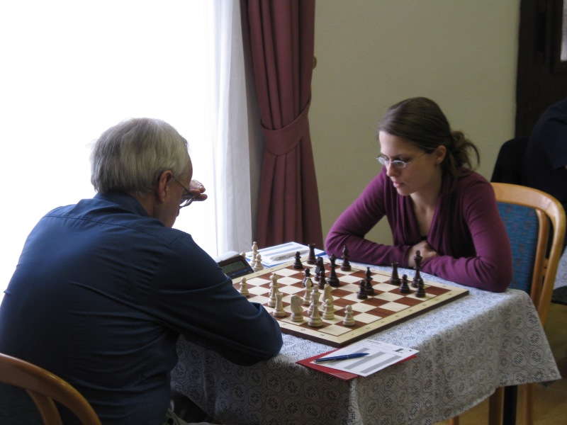 Rebekka trat für uns an Brett 8 an. Sie verkaufte sich entgegen dem zu Erwartenden sehr gut, stand zwischenzeitlich gegen ihren 400 Punkte mächtigeren Gegner mit den schwarzen Steinen gewinnträchtig, ließ sich dann aber leider am Ende wohl einzügig mattsetzen. Sie hatte eigentlich mehr verdient. An dieser Stelle ein großes Lob für ihren unerschrockenen Tatendrang.