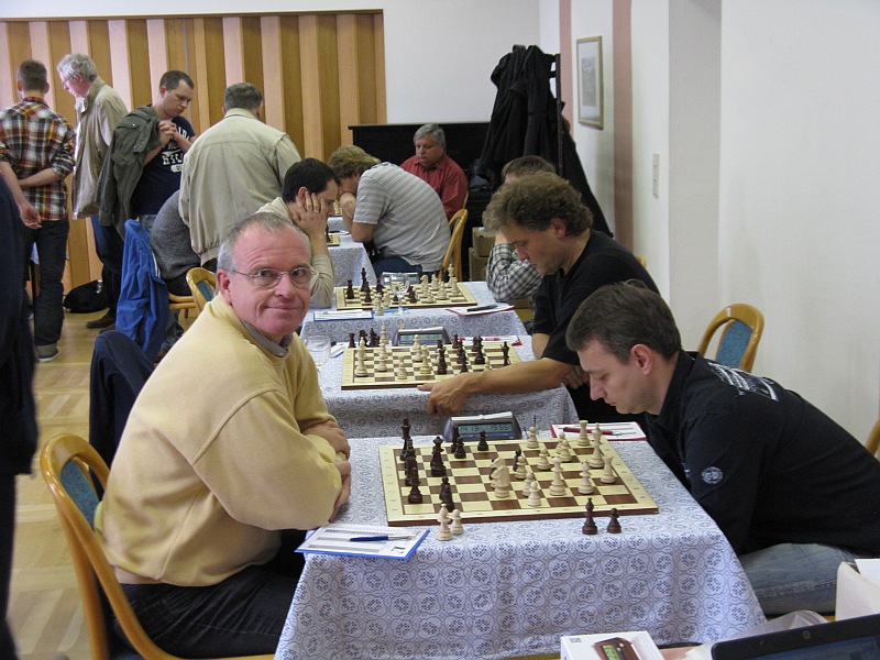 Der Zwischenstand von 2 ½ : 2 ½ versprach weiterhin Spannung. Die letzten drei Partien sollten die Entscheidung bringen. Christian an Brett 1 knetete wenig erfolgverheißend eine Remis-Stellung, Martin an Brett 4 stand beim Turm und ungleiche Läufer-Endspiel bei wechselseitigen Freibauern ziemlich unklar und meiner einer hatte an Brett 6 mit Schwarz eigentlich durchweg bequemes Spiel. Nachdem mein Gegner in Zeitnot eine Figur verlor und alsbald aufgeben konnte, war es an Christian und Martin die beiden notwendigen Remisen nach Hause zu bringen.