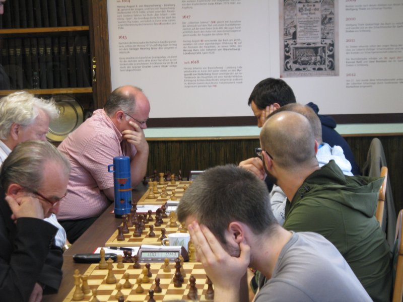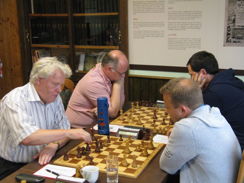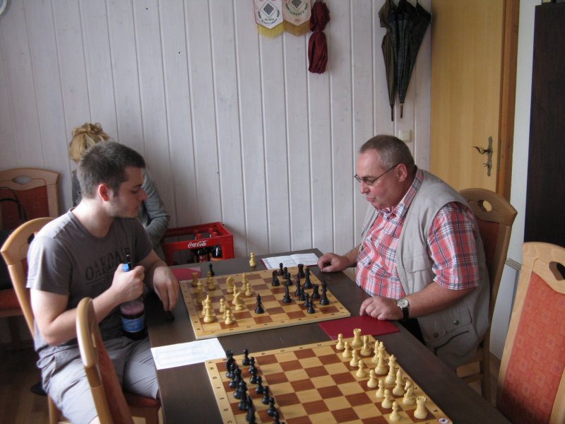 Christian stand völlig ausgeglichen gegen Heinz Liebert. Auch ich bekam Französisch auf das Brett, entschied mich jedoch für die Schlagvariante und spielte mit isoliertem Bauern und etwas mehr Initiative gegen einen gut konsolidierten schwarzen Aufbau. Auch Sebastian kam gut aus der Eröffnung und hatte aktivere Figuren in seiner Stellung, welche aus einem 3.Lb5 - Sizilianer entstanden war.