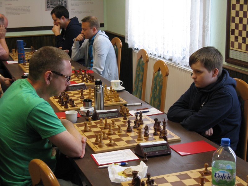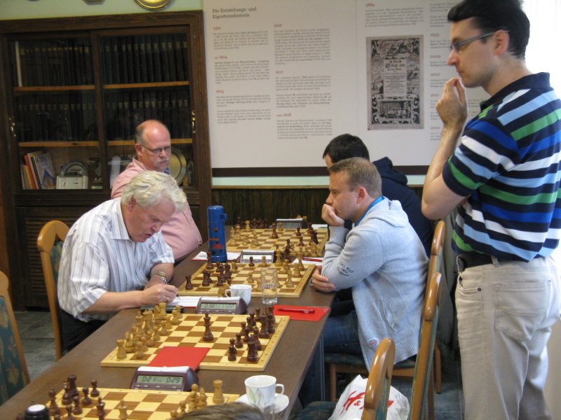 Martin am ersten Brett spielte Caro Kann und stand mit einer schlechteren Bauernstruktur sehr passiv. Holly hingegen spielte gegen einen unorthodoxen französischen Aufbau. Während er seine Figuren zielgerichtet auf gute Felder verteilte, wartete sein Gegner Burkhard Malich mit sich wiederholenden Damenzügen ab.
